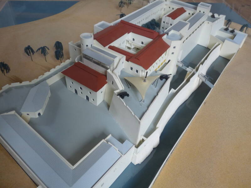 - De algemene herbouw op het grote binnenplein (de paradeplaats) heeft ongeveer de hele 17de eeuw in beslag genomen. De oude Portugese kerk op het binnenhof was een doorn in het oog van de Nederlandse directeur-generaal, want meteen na zijn intrek gaf hij de instructie om de ‘paapse’ symbolen van de kerk te slopen en het gebouw om te dopen tot handelshuis of ‘huis van negotie’. Men bracht er een extra verdieping in aan, zodat het gelijkvloers voortaan dienst kon doen als opslagplaats en de soldaten op de bovenste etage hun verstrooiing konden zoeken. Er werd ook nog een keuken vlakbij het handelshuis gebouwd. In de omringende gebouwen lagen de soldatenverblijven op de bovenverdiepingen, met daaronder langs de noordoostwal de mannelijke slavencellen. Dit mannelijke slavengat, zoals het in de bronnen wordt aangeduid, was strikt gescheiden van de vrouwelijke slavencellen, die uitkeken op het kleine binnenplein in het gouvernementskwartier.